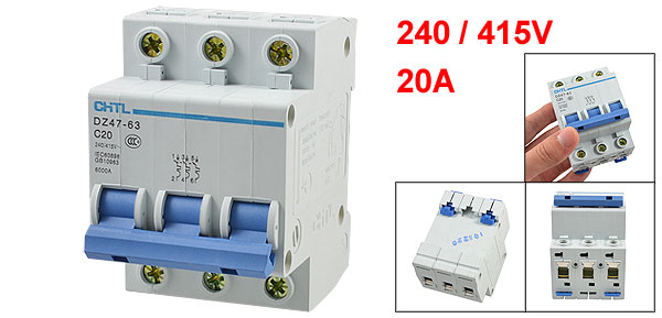 Product Name Circuit Breaker Model No. DZ47-63 C20 Material Plastic, Electric Components Rated Voltage 240 / 415V Rated Current 20A Breaking Capacity 6000A Frequency 50/60Hz Total Size (Approx.) 77 x 54 x 65mm/ 3" x 2.1" x 2.6" (L*W*H) Number of Poles 3 Mount Type DIN Rail Color As Picture Shown Weight 240g Package Content 1 x Circuit Breaker - Reviews