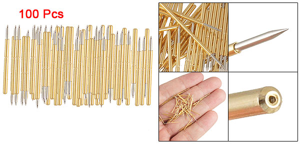 Product Name Test Probe Model No. P100-B Tip Type 30° Spear Tip Dia(Approx) 1mm / 0.016" Barrel Size(Approx) 1.3 x 24.7mm / 0.051" x 0.972"(D*L) Overall Length(Approx) 33mm / 1.300" Color Gold Tone Net Weigth 23g Package Content 100 Pcs x Test Probe - Reviews