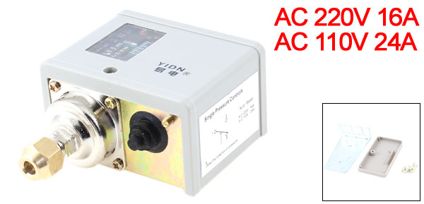 AC 110V 24AFlare Nut Hole 6.6mm / 0.26" Fixing Hole Diameter 3mm / 0.12" Fixing Hole Distance 25mm / 1" Overall Size 8 x 4.6 x 10cm / 3.1" x 1.8" x 3.9" (L* W * H) Material Metal, Plastic , Electric Parts Net Weight 441g Package 1 x Pressure Switch 1 x Bracket Several Screws