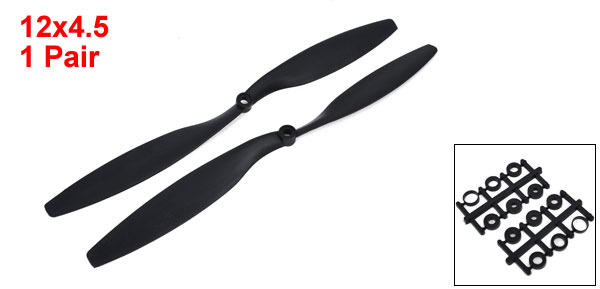 DetailsPair Double Blades 12x4.5 Black Plastic RC Model Airplane Propeller Paddle  Product Name 1045 Propeller Blade Number 2 Model 12x4.5(Non-OEM) Motor Shaft Hole Dia 6.3mm / 0.25",9mm/ 0.35"(Contary) Total Length(Rotating Diameter) 305mm / 12" Pitch 114mm / 4.5" Max Thickness 9.7mm / 0.38" Shaft Size Adapter Ring Inner Dia Biggest: 8.3mm/0.33" Smallest: 3.2mm/0.13" Material Plastic Color Black Net Weight 20g Package Content Pair x Propellers 12 x Shaft Size Adapter Rings