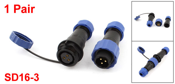 Product Name Waterproof Aviation Connector Model SD16-3 Connector Type Plug + Socket Waterproof Level IP68 Rated Current / Voltage AC 500V/30A Withstand Voltage AC 1500V Cable Range 4-8mm Terminals 3 Pins Total Size 60 x 22mm / 2.4" x 0.87" (L*D) Material Plastic, Brass Color Blue, Black, Gold Tone Weight 35g Package Content 1 Pair x Waterproof Aviation Connector - Reviews
