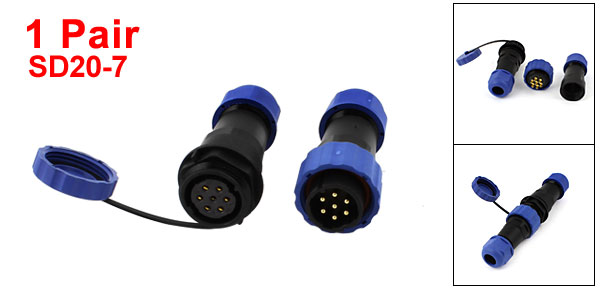 Product Name Waterproof Aviation Connector Model SD20-7 Connector Type Plug + Socket Waterproof Level IP68 Rated Current / Voltage AC 500V/15A Withstand Voltage AC 1500V Cable Range 7-11mm Terminals 7 Pins Total Size 65 x 28mm / 2.5" x 1.1" (L*D) Material Plastic, Brass Color Blue, Black, Gold Tone Weight 54g Package Content 1 Pair x Waterproof Aviation Connector - Reviews