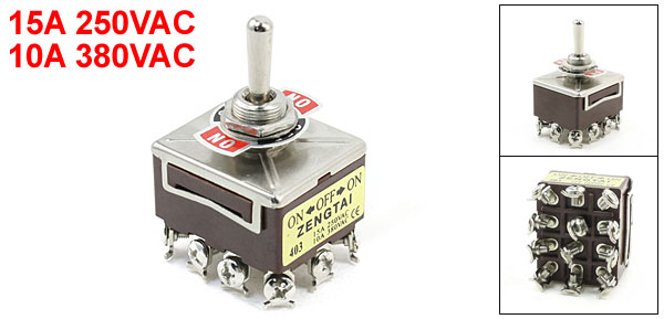 Product Name Toggle Switch Type 4PDT Latching Position ON-OFF-ON 3 Postion Voltage & Current 15A 250VAC 10A 380VAC Total Size 4 x 3 x 5.8cm/1.6" x 1.2" x 2.3"(L*W*H) Thread Dia 12mm Material Metal, Plastic Weight 64g Package Content 1 Pcs x Toggle Switch - Reviews