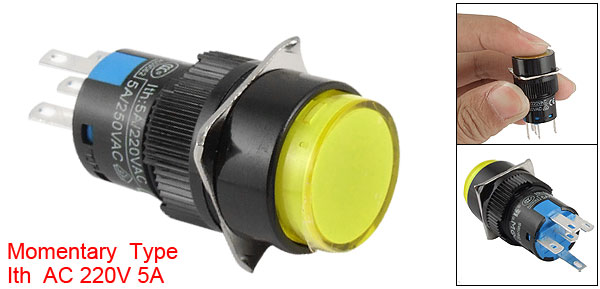 Item Name Push Button Switch Switch Type Momentary (1 NO, 1 NC) Switch Working Voltage AC 250V, 5A Indicator Lamp Voltage DC 24V Thermal Current(Ith) AC 220V 5A Light Color Yellow Switch Color Black, Yellow, Blue Button Cap Diameter 16mm/0.63" Mounting Thread Dia. 16mm/0.63" Total Size 18 x 41mm/ 0.71" x 1.6"(D*H) Material Plastic, Electronic Parts Weight 7g Package Content 1 x Push Button Switch - Reviews