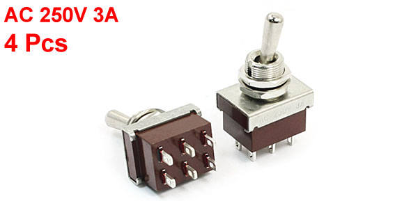 Product Name Toggle Switch Model KN3-3 Type 2PDT (Latching) Position 2 Positions (ON/OFF) Voltage, Current AC 250V 3A Mounting Thread Diameter 11 mm / 0.43" Main Body Size 2.5 x 1.7 x 1.5 cm / 1" x 0.67" x 0.6" (L*W*H) Overall Height 4.3cm / 1.7" Color Brick Red, Silver Tone Net Weight 90g Package Content 4 x Toggle Switch - Reviews