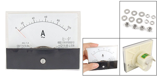 Product Name Analog Ammeter Model 44L1-A Type AC Accuracy Class 2.5 Measuring Current Range AC 0-100A Total Size 9.8 x 7.8 x 6.5cm/3.9'' x 3.1'' x 2.6'' (L*W*H) Base Size(Not Included Screw) 4.9 x 3.6 x 3.3cm/1.9'' x 1.4'' x 1.3'' (L*W*H) Thread Dia. 0.4cm/0.16'' Material Pllastic Color Black, Clear Net Weight 151g Package Content 1 x AC Analog Ammeter