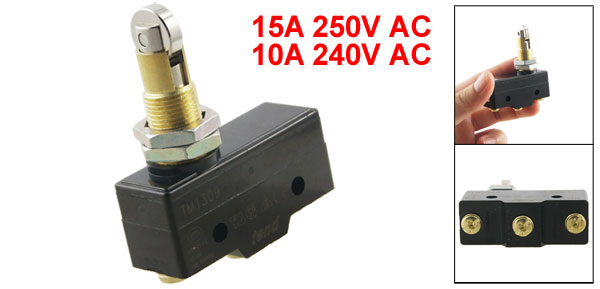 Product Name Limit Switch Model No. TM1309 Mounting Type Panel Mount Terminals 3 Screw Terminal Contact Configuration 1NO,1NC(SPDT) Actuator Type Cross Roller Plunger Rating & Voltage 15A 250V AC 10A 240V AC Switch Body Size ~5 x 1.8 x 2.7cm / 1.97 x 0.7 x 1.1"(L*W*H) Fixing Holes Dia. ~0.4cm / 0.16“ Distance Between Centers of Fixing Holes ~2.5cm / 0.98" Roller Actuator Size Height from Body (open): ~3.4cm / 1.34”