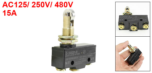 Product Name Limit Switch Model No. Z-15GW21-B Terminal Style 3 Screw Terminal Actuator Type Long Straight Hinge Lever , Automatic Reset Rating & Voltage AC125/ 250V/ 480V, 15A Power 1/8HP/ AC125V, 1/4HP/ AC250V Roller Dia. 12.5 x 4.5mm/ 0.5" x 0.14"(D*T) Fixing Holes Dia. 0.4cm / 0.16“ Hole Center Point Distance 2.5cm / 0.98" Switch Body Size 5 x 1.8 x 2.8cm / 1.97 x 0.7 x 1.1"(L*W*H) Body Main Color Black Net Weight 51g Package Content 1 x Limit Switch - Reviews