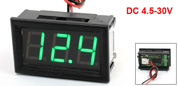 DetailsPanel Mount DC 4.5-30V Green LED Display Volt Meter Digital Voltmeter  Product Name LED Voltmeter Measure Range DC 4.5-30V LED Display Size 3.8 x 1.8cm/ 1.5" x 0.7"(L*W) Power Supply DC 5V Display Method 7 Segment LED Display Total Size 4.8 x 2.9 x 2cm/ 1.9" x 1.1" x 0.8"(L*W*T) Panel Mounting Size 4.5 x 2.5cm/ 1.4" x 1"(L*W) External Material Plastic Display Color Green Shell Color Black Weight 20g Package Content 1 x LED Voltmeter 1 x Powe Cable