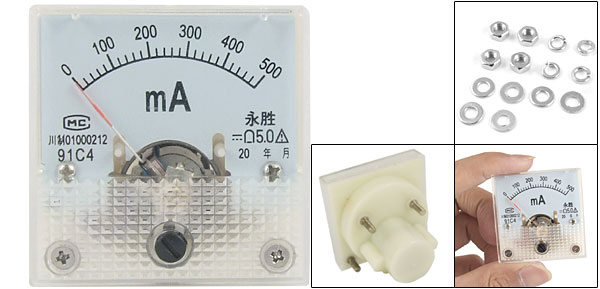 Product Name Analog Ammeter Model 91C4 Accuracy Class 5.0 Measuring Range DC 0-500mA Meter Face Size(Approx) 4.4 x 4.4 x 0.8cm/1.7" x 1.7" x 0.3"(L*W*T) Thread Diameter 2.7mm/0.1" Overall Depth 3.5cm/1.37" Color As Picture Show Net Weight 32g Package Content 1 x Mini Analog Ammeter Installing Parts - Reviews