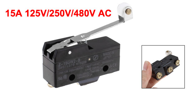 Product Name Micro Switch Model No. Z-15GW2-B Contact Type 1NO, 1NC, 1 Com Mounting Type Panel Mount Termination Style Screw Terminal Actuator Type Long Hinge Roller Lever Rating 15A 125V/250V/480V AC