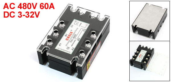 Product Name Solid State Relay Model No. TN1/360D Input 3-32VDC Output 480VAC 60A Pole Numbers 3P Size (Approx.) 104 x 73 x 35 / 4.1" x 2.9" x 1.4" (L*W*T) Main Color Black, Silver Tone Material Metal, Plastic, Electric Parts Weight 342g Package Content 1 x Solid State Relay
