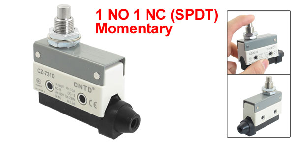 Product Name Limit Switch Model No. CZ-7310 Actuator Action Momentary Actuator Type Panel Mount Plunger Contact Type 1 NO, 1 NC, 1 Com(SPDT) Terminal Type Screw Terminals Ui 380V Ith 10A AC-15 Ue: 250V, le: 6A DC-13 Ue: 220V, le: 0.3A Threaded Dia 12mm/ 0.47" Total Size 69 x 22 x 65mm/ 2.7" x 0.9" x 2.6" (L*W*H) Material Metal, Plastic Color As Picture Shown Weight 82g Package Content 1 x Limit Switch - Reviews