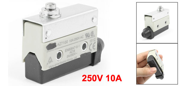Product Name Limit Switch Model No. AZ7100 Actuator Action Momentary Actuator Type Panel Mount Plunger Contact Type 1 NO, 1 NC, 1 Com(SPST) Rated Voltage 250V Rated Current 10A Hole Dia 0.44cm/ 0.17" Body Size 69 x 21 x 41mm/ 2.7" x 0.83" x 1.6"(L*W*H) Overall Height 66mm/ 2.6" Material Metal, Plastic Color Gray, Black Weight 61g Package Content 1 x Limit Switch - Reviews