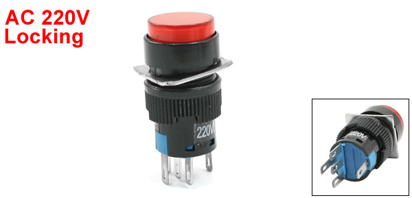Product Name Push Button Switch Contact Type Locking (SPDT) Working Current & Voltage AC 250V 3A DC 30V 5A Light Color Red Lamp Voltage AC 220V Terminal Quantity 5 Mounting Dia 15mm/0.59" Total Size(Approx) 4 x 1.8 x 1.8cm/1.6" x 0.7" x 0.7"(L*W*T) External Material Metal, Plastic Color Red, Black Net Weight 9g Package Content 1 x Push Button Switch - Reviews