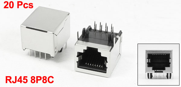 Product Name RJ45 Jack Feature RJ45 8P8C Material Plastic, Metal Color Black, Silver Tone Total Pin Number 8 Pin Type Round Pin,PCB Mounting Pin Angle & Location Right Angle Pins in the Rear Each Size (Approx.) 18 x 15.5 x 12mm / 0.7" x 0.6" x 0.5" (L*W*H) Net Weight 100g Package Content 20 x RJ45 PCB Jack - Reviews