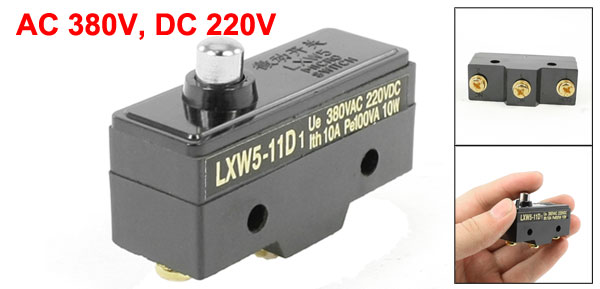 Product Name Micro Switch Model No. LXW5-11D1 Contact Type 1NO, 1NC, 1 Com Mounting Type Panel Mount Termination Style Screw Terminal Actuator Type Pin Plunger Rating Ue: AC 380V, DC 220V