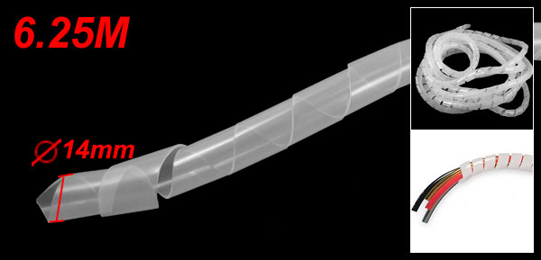 Product Name Spiral Wrap Material Polyethylene Color Clear Total Length 6.25M / 20 Ft (246") Outside Diameter 14mm / 11/20" Thickness 1mm / 0.039" Net Weight 152g Package Content 1 x Spiral Wrap - Reviews