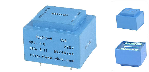 Product Name Encapsulated Transformer Model PE4215-M Power 6VA, 50/60 Hz Input 220V Output 9V / 0.667A Pins Quantity 4 Distance Between Input Pins 25mm Distance Between Output Pins 15mm Total Size(Approx.) 44.5 x 37.5 x 40.3mm/1.75" x 1.48" x1.59"(L*W*H) Color Blue Weight 195g Package Content 1 x Encapsulated Transformer - Reviews