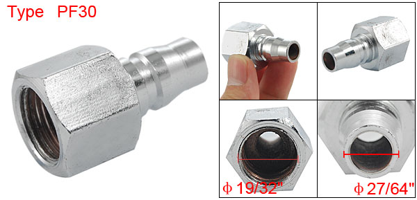 Product Name Air Quick Coupler Type PF30 Fit Pipe Inside Dia 10.8mm / 27/64" Thread Inside Dia 15mm / 19/32" Fluid Air Overall Size 38 x 21mm / 1.5" x 0.8" (L*Max.D) Color Silver Tone Material Metal Weight 39g Package 1 x Air Quick Coupler - Reviews
