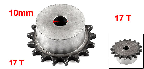 Product Name Chain Drive Sprocket Material Metal Color Gray Teeth Number 17 Pitch 10mm/ 0.4" Upper Diameter 55mm/ 2.2" Bottom Diameter 33mm/ 1.3" Bore Diameter 10mm/ 0.4" Total Height 22mm/ 0.9" Net Weight 209g Package Content 1 x Chain Drive Sprocket - Reviews