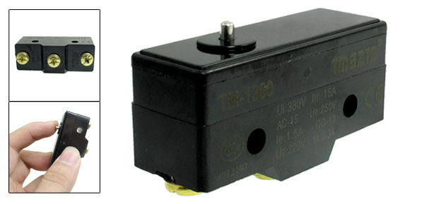 Product Name Limit Switch Model No. TM-1300 Conact Configuration 1NO,1NC(SPDT) Actuator Action Momentary Actuator Type Pin Plunger Actuator Terminal 3 Screw Terminal Ui 380V Ith 15A AC-15 Ue: 250V, le: 1.5A DC-13 Ue: 220V, le: 0.3A Switch Body Size ~4.8 x 1.7 x 2.3cm / 1.9 x 0.7 x 0.9"(L*W*H) Fixing Holes Dia. ~0.44cm / 0.17“ Distance Between Centers of Fixing Holes ~2.5cm / 0.98" Actuator Size 0.3 x 0.2cm / 0.12" x 0.08"(L*D) Color Black Net Weight 30g Package Content 1 x Limit Switch - Reviews