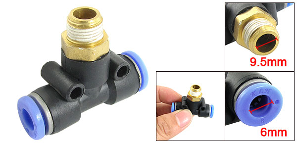 Product Name Pneumatic Quick Fittings Type T Connector One Touch Connector 6mm/ 1/4" Thread Connector 9.5mm/ 0.37" Material Plastic Dimension (Approx) 3.8 x 3.3 x 1.3cm/ 1.5" x 1.3" x 0.51" (L*W*T) Color Black, Blue Weight 15g Package Content 1 x Pneumatic Quick Fittings - Reviews