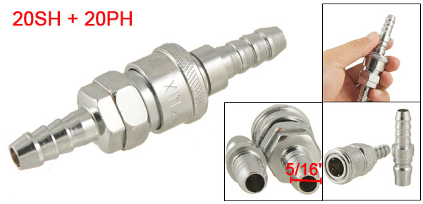 Product Name Quick Coupler Set Type 20SH + 20PH Fit Hose Diameter 5/16" Fluid Applied Air Hose Tail Diameter 8mm / 5/16" Overall Size 94 x 25mm/ 3.7" x 1" (L*max.D) Hose Tail Length 26mm/ 1.02" Color Silver Tone Material Metal Weight 96.7g Package 1 x Quick Coupler Set - Reviews