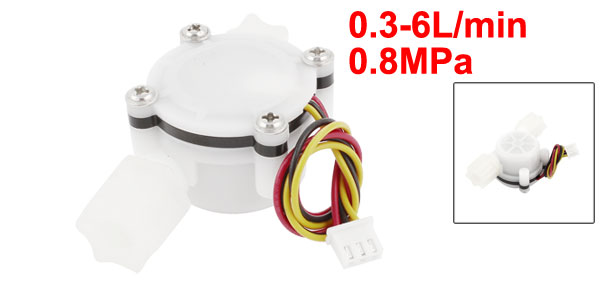 Product Name Water Flow Sensor Working Range 0.3-6L/min Working Pressure 0.8MPa Outlet=Inlet Port Hole Dia. 7mm/ 0.28" Total Size 73 x 35 x 27mm / 2.9" x 1.4" x 1.1"(L*W*T) Cable Length 15cm / 5.9" Connector Type 3Pin JST Connector External Material Plastic, Metal Color White Weight 34g Package Content 1 x Water Flow Sensor - Reviews