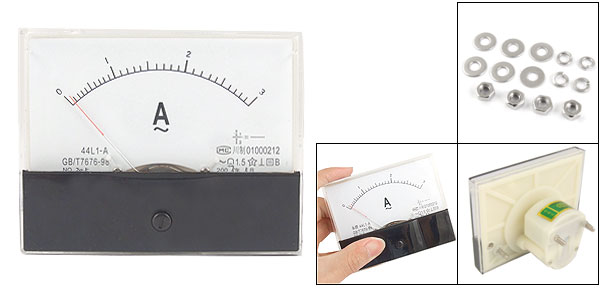 Product Name Analog Ammeter Model 44L1-A Type AC Accuracy Class 2.5 Measuring Current Range AC 0-3A Total Size 9.8 x 7.8 x 6.5cm/3.9'' x 3.1'' x 2.6'' (L*W*H) Base Size(Not Included Screw) 4.9 x 3.6 x 3.3cm/1.9'' x 1.4'' x 1.3'' (L*W*H) Thread Dia. 0.4cm/0.16'' Material Pllastic Color Black, Clear Net Weight 147g Package Content 1 x AC Analog Ammeter