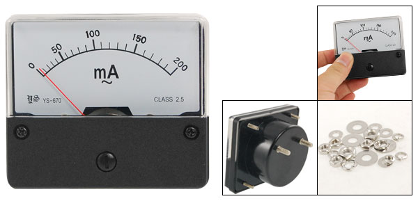 Product Name Analog Ammeter Model YS-670 Measuring Current Range AC 0-200mA Accuracy Class 2.5 Meter Face Size(Approx.) 7 x 5.8 x 1.1cm/ 2.7" x 2.3" x 0.4"(L*W*T) Thread Size 0.4 x 1cm / 0.16" x 0.4"(D*L) 0.28 x 0.8cm / 0.11" x 0.31"(D*L) Base Diameter 5cm/2'' Overall Depth 3.4cm/ 1.3" Screw Spacing 2.8cm/1.1'' 4.8m/1.9'' Color Black, White Net Weight 78g Package Content 1 x Analog Ammeter Several Installing Parts - Reviews
