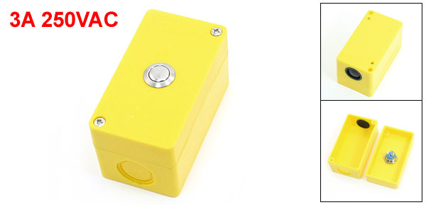 Product Name Push Button Station Action Type Momentary Contact Type SPST Working Voltage & Current 3A 250VAC Max. Withstand Current 16A Button Dia 1.8cm/0.7" Overall Size 9 x 5 x 5cm/3.5" x 2" x 2"(L*W*H) Wire Hole Dia 20mm/0.78" Mounting Hole Dia 4mm/0.16" Mount Hole Distance 60mm x 35mm/2.4" x 1.4"(L*W) Material Plastic, Metal Color Yellow, Silver Tone Net Weight 72g Package Content 1 x Push Button Station - Reviews