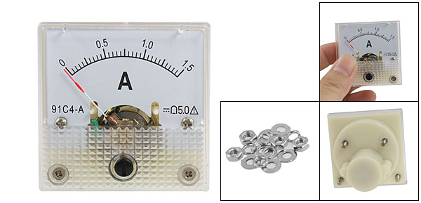 Product Name Analog Ammeter Model 91C4 Accuracy Class 5.0 Measuring Range DC 0-1.5A Meter Face Size(Approx) 4.4 x 4.4 x 0.8cm/1.7" x 1.7" x 0.3"(L*W*T) Thread Diameter 2.5mm/0.09" Overall Depth 3.5cm/1.37" Color Clear, White Net Weight 33g Package Content 1 x Mini Analog Ammeter Installing Parts - Reviews