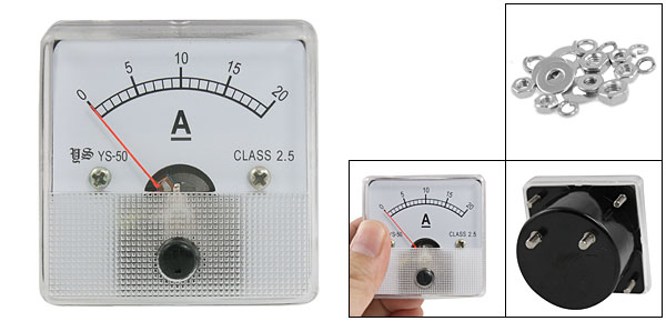 Product Name Analog Amperemeter Model No. YS-50 Measuring Ampere Range DC 0-20A Accuracy Class 2.5 Meter Face Size(Approx) 5 x 5 x 1.1cm / 2" x 2" x 0.4"(L*W*T) Thread Dia(Approx) Big One: 0.38cm / 0.150" Small One: 0.28cm / 0.110" Overall Depth 4.5cm / 1.8" Color Clear, White, Black Material Metal & Plastic Net Weight 57g Package Content 1 x Analog Amperemeter Several Installing Parts - Reviews