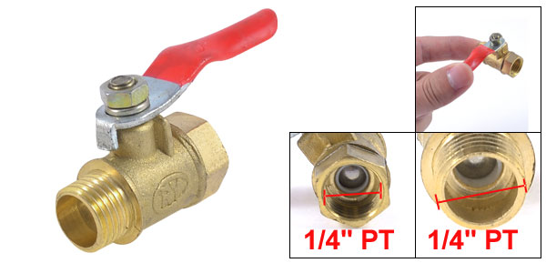 Product Name Lever Handle Ball Valve Type Male Thread to Female Thread(F/M) Handle Size 27 x 11mm/ 1" x 0.4"(L*W) Body Size 30 x 27mm/ 1.1" x 1"(L*W) Male Thread Size 1/4" PT Material Brass Color Gold Tone, Red Net Weight 33g Package Content 1 x Lever Handle Ball Valve - Reviews