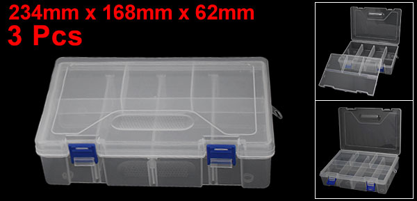 Product Name Storage Box Material Plastic Color Clear Compartment Quantity 8 Case Total Size (External) 234 x 168 x 62mm/ 9.2" x 6.6" x 2.4" (L*W*H) Compartment Size (Internal) Big:220 x 71 x 16mm / 8.6" x 2.8" x 0.6" (L*W*H)