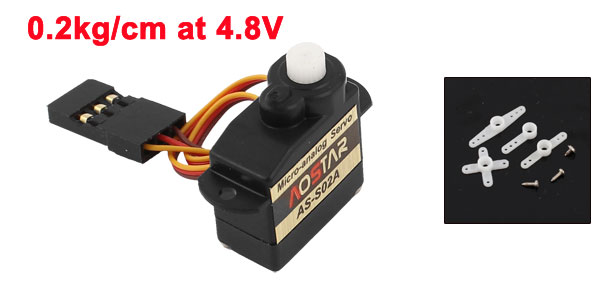 DetailsPlastic Gear Digital Torque AS-S02A Analog Micro Servo Kit 2g for RC Airplane  Product Name AS-S02A Analog Servo Model AS-S02A Operating Speed 0.08sec/60 degrees at 4.8V Torque 0.2kg/cm at 4.8V Temperature range 0 to 55 C Weight 2g Total Weight 6g Total Size 23 x 8 x 20mm/0.9" x 0.31" x 0.79"(L*W*H) Wire Length 10cm/3.9" Package Content 1 x AS-S02A Analog Servo, Some Horns