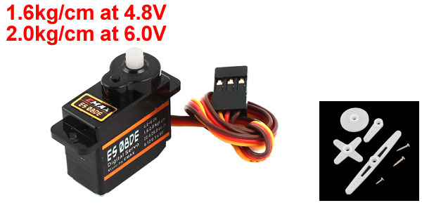 2.0kg/cm at 6.0VTemperature range 0 to 55 C Operating Voltage 4.8 - 6.0V Plug Available FUT; JR Net Weight 8g Total Weight 17g Total Size 23 x 11.5 x 24mm/0.91" x 0.43" x 0.94"(L*W*H) Wire Length 25cm/9.8" Package Content 1 x ES08DE Micro Analog Servo, Some Hardwares - Reviews