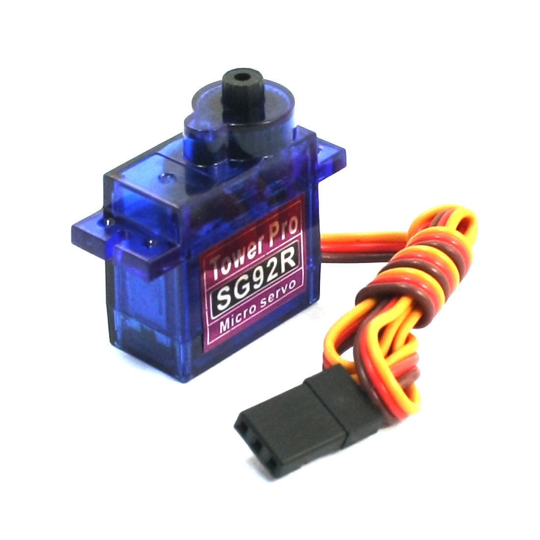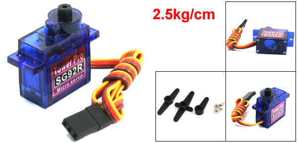 Product Name SG92R Micro Servo Model SG92R Operating Speed 0.1sec/60degree at 4.8V Torque 2.5kg/cm Temperature range 0 to 55 C Operating Voltage 4.2-6V Weight 9g Total Size 33 x 12.2 x 30mm/1.3" x 0.48" x 1.2"(L*W*H) Wire Length 24.5cm/0.96" Package Content 1 x SG92R Micro Servo, Some Hardware Parts - Reviews