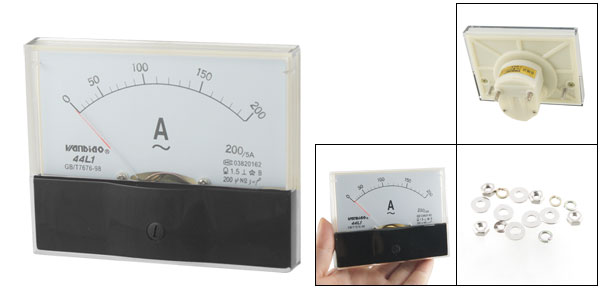 Product Name Analog Ammeter Measuring Current Range AC 0-200A Accuracy Class 2.5 Meter Face Size 10 x 7.9 x 1.2cm/ 3.9" x 3.1" x 0.47" (L*W*T Thread Size 0.38 x 0.75cm / 0.15" x 0.29"(Dia.*L) Overall Depth 5.76cm / 2.3" Material Plastic, Electronic Components Color White, Black Net Weight 139g Package Content 1 x Analog Ammeter