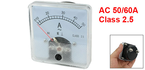Product Name Analog Amperemeter Model No. YS-50 Measuring Ampere Range AC 50A Accuracy Class 2.5 Meter Face Size(Approx) 6 x 6 x 3.5cm / 2" x 2" x 1.3"(L*W*T) Thread Dia(Approx) Big One: 0.38cm / 0.150"