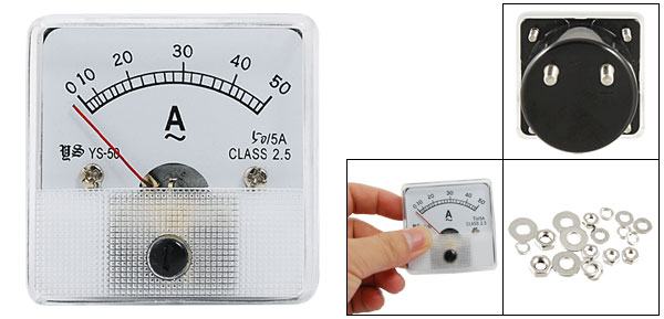 Product Name Analog Amperemeter Model No. YS-50 Measuring Ampere Range AC 50A Accuracy Class 2.5 Meter Face Size(Approx) 5 x 5 x 1.1cm / 2" x 2" x 0.4"(L*W*T) Thread Dia(Approx) Big One: 0.38cm / 0.150" Small One: 0.28cm / 0.110" Overall Depth 4.5cm / 1.8" Color Clear & White & Black Material Metal & Plastic Net Weight 63g Package Content 1 x Analog Amperemeter Several Installing Parts - Reviews