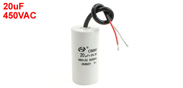 Product Name Motor Capacitor Housing Material Plastic Dielectric Material Metallized Polypropylene Film Model CBB60 Capacitance 20uF Tolerance ±5% Rated Voltage 450VAC Frequency 50/60Hz Temperature Coefficient 25/85/21 Body Size 4 x 8.3cm / 1.6" x 3.25" (D * H) Wire Length 18.5cm / 7.3" Color White, Black Weight 119g Package Content 1 x Motor Capacitor - Reviews