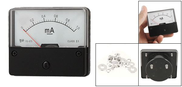 Product Name Analog Ammeter Measuring Current Range DC 0 - 1.0mA Accuracy Class 1.5 Meter Face Size(Approx) 7 x 6cm/ 2.7" x 2.3" (L*W) Thread Size 0.28 x 0.75cm / 0.11" x 0.30" (D*L) 0.38 x 0.8cm / 0.15" x 0.3" (D*L) Overall Depth 4.3cm/ 1.7" Color White, Black Net Weight 68g Package Content 1 x Analog Ammeter Fitting Part - Reviews