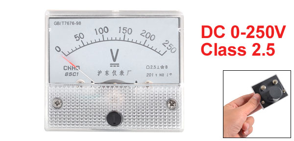 Product Name DC Voltage Panel Meter Scale Range DC 0-250V Accuracy Class 2.5 Material Plastic Color White, Clear, Black Back Screw Dia. 3.8 mm / 0.15" & 2.8 mm / 0.11" Panel Size 6.3 x 5.5 x 1.1 cm / 2.5" x 2.2" x 0.4" (L*W*T) Overall Depth 4.3 cm / 1.69" Weight 61g Package Content 1 x DC Voltage Panel Meter - Reviews