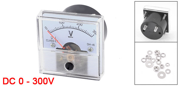 Product Name Analog Voltmeter Model DH-45 Measuring Voltage Range DC 0 - 300V Accuracy Class 2.5 Meter Face Size(Approx) 4.5 x 4.3 x 1.3cm / 1.8" x1.7" x 0.51"(L*W*T) Thread Size 0.4 x 0.8cm / 0.16" x 0.31"(Dia.*L)