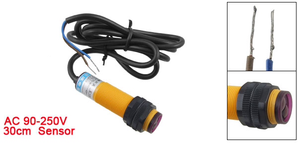 Product Name Photoelectric Switch Sending Light Infrared Rays Model E18-B03A1 Type AC 2 Wire Proximity-sensing / Diffuse Type Voltage AC 90-250V Current <500mA Sensory Distance 30cm Head Diameter 1.6cm/0.6'' Body Size 2.4 x 7cm/0.9'' x 2.8'' (Max.D*L)
