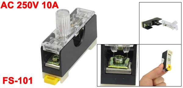 DetailsPlastic Single Pole AC250V 10A FS-101 Fuse Holder Base 6mm x 30mm  Product Name Fuse Holder Base Type FS-101 Suitable for Fuse Size 6 x 30mm (D * H) Rated Voltage AC 250V Rated Current 10A Material Plastic, Metal Color Black, White, Yelow Holder Size 5.5 x 4.5 x 1.5cm/ 2.2" x 1.8" x 0.6"(L*W*T) Weight 19g Package Content 1 x Fuse Holder Base