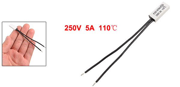 Product Name Temperature Control Switch Model.No KSD9700 Material Plastic Contact NC(Normal Close) Rated Voltage 250V Current 5A Max Rated Disconnection Temperature 110C Color Black, White Cable Length 8cm/ 3.1" Head Dimension 20 x 8 x 4mm/0.78" x 0.31" x 0.16"(L*W*T) Net Weight 3g Package Content 1 x Temperature Control Switch - Reviews