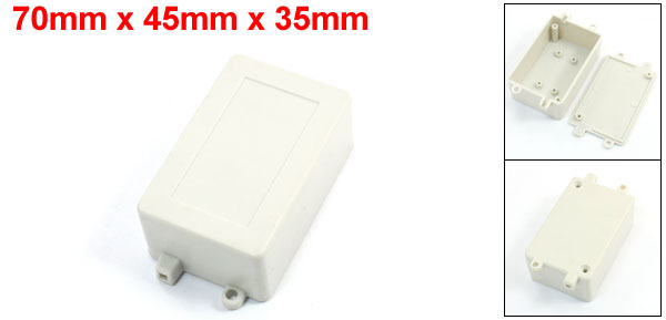 Product Name Junction Box Mounted Type Surface Mounted External Size 70 x 45 x 35mm/2.8" x 1.8" x 1.6"(L*W*H) Internal Size 62 x 38 x 30mm/2.4" x 1.5" x 1.2"(L*W*H) Total Length 83mm/3.2" Fixing Hole Diameter 4mm/0.24" Fixing Hole Center Distance 80 x 25mm/3.1" x 1"(L*W) Material Plastic Color Light Gray Net Weight 26g Package 1 x Junction Box - Reviews